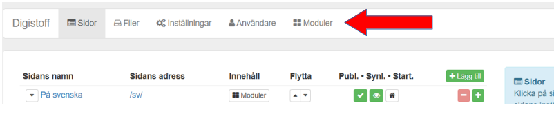 Bland flikarna högst upp på sidan hittar du fliken Moduler. Klicka på fliken Moduler.