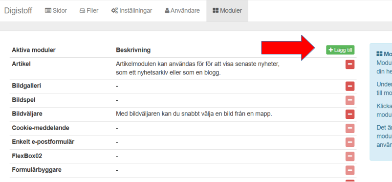 Under fliken Moduler listas alla moduler som du använder dig av. Om du trycker på knappen Lägg till får du fram de moduler som ännu inte är aktiverade.