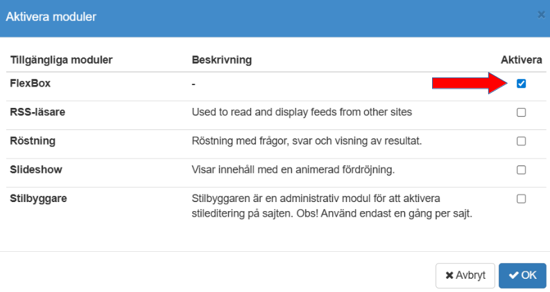 Aktivera en modul genom att klicka i rutan Aktivera vid den modulen som önskas aktiveras. I det här fallet klickas Aktivera för modulen FlexBox. Klicka sedan på OK.