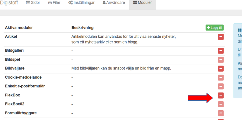 Det går också att ta bort moduler vid behov. I det här fallet så önskas den nyligen tillagda modulen FlexBox tas bort. Klicka på det röda minustecknet och modulen tas bort.