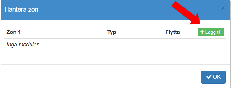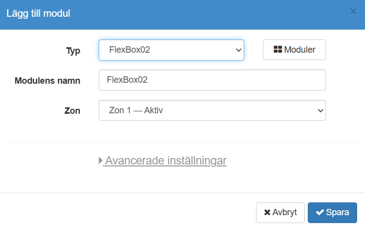 För att lägga till FlexBox02 modulen på en sida, välj Moduler uppe till vänster.