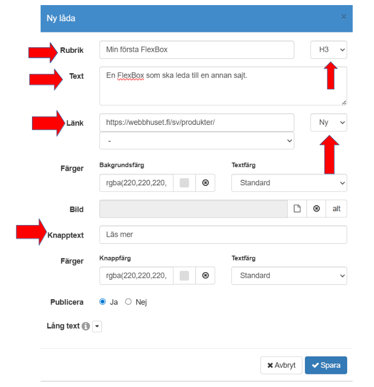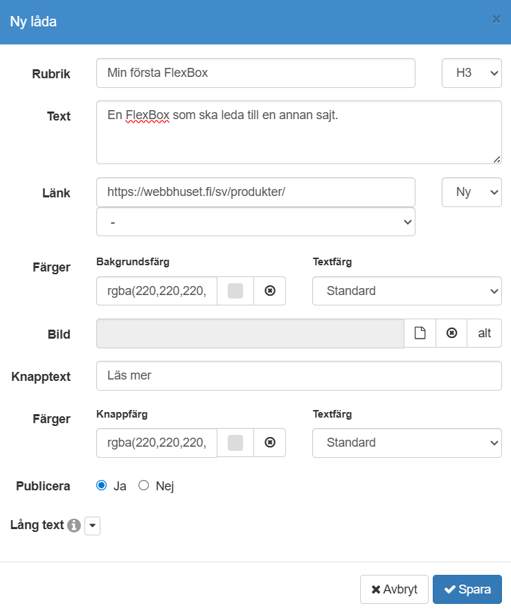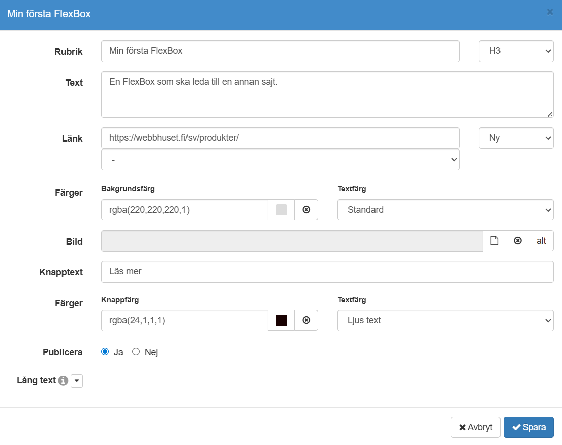 Här ges möjligheten att sätta en rubrik till denna första av våra två FlexBoxar. Det går också att skriva en kortare text. I det här fallet vill vi att denna FlexBox ska leda besökare till en annan sajt. Så här har nu FlexBoxen fyllts i som exempel.