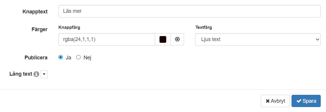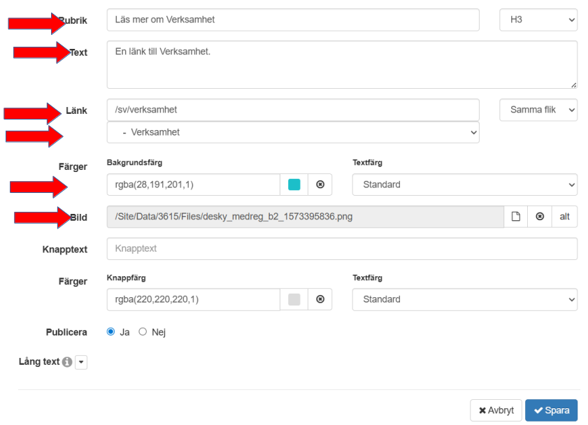 Rubriken har fyllts i precis som ett kortare textfält. Ute i högerkanten har rubrikens storlek ändrats till H3, det vill säga, en aningen mindre textstorlek. I det här fallet har det i fältet för Länk satts in en URL (länk) till Webbhusets startsida. Vi har också valt att målet för den länken är Ny. Det betyder att länken öppnas i en ny flik i webbläsaren. Slutligen har det lagts till en knapptext som heter Läs mer.