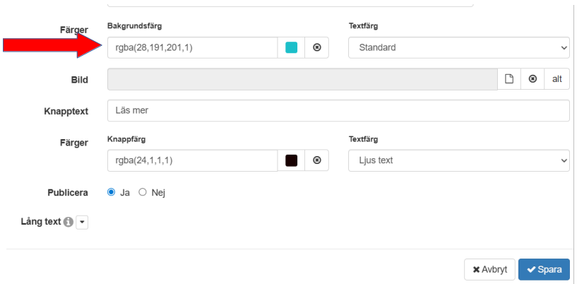 Bakgrundsfärg kan ändras antingen genom att sätta in en rgba kod direkt eller välja från färgskalan. Bra att komma ihåg är kontraster, att undvika färger som gör att text blir svårt att läsa.