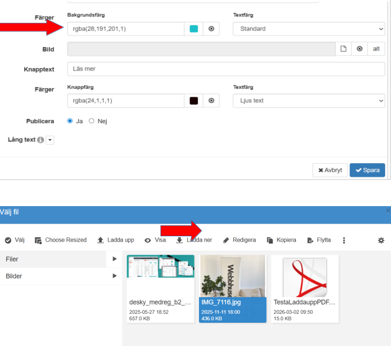 På den övre bilden, klicka på ikonen direkt om det grå Bild-fältet. Då tas du vidare till en vy där fil kan väljas (bilder som finns uppladdade i Digistoff). I det här fallet väljs bilden i mitten. Dubbelklicka på bilden och därefter Spara. Då har FlexBoxen fått en länk till en annan sajt (Webbhusets startsida), en ny bakgrundsfärg och en bakgrundsbild. Det betyder att FlexBoxen i det här fallet kommer att se ut så här:
