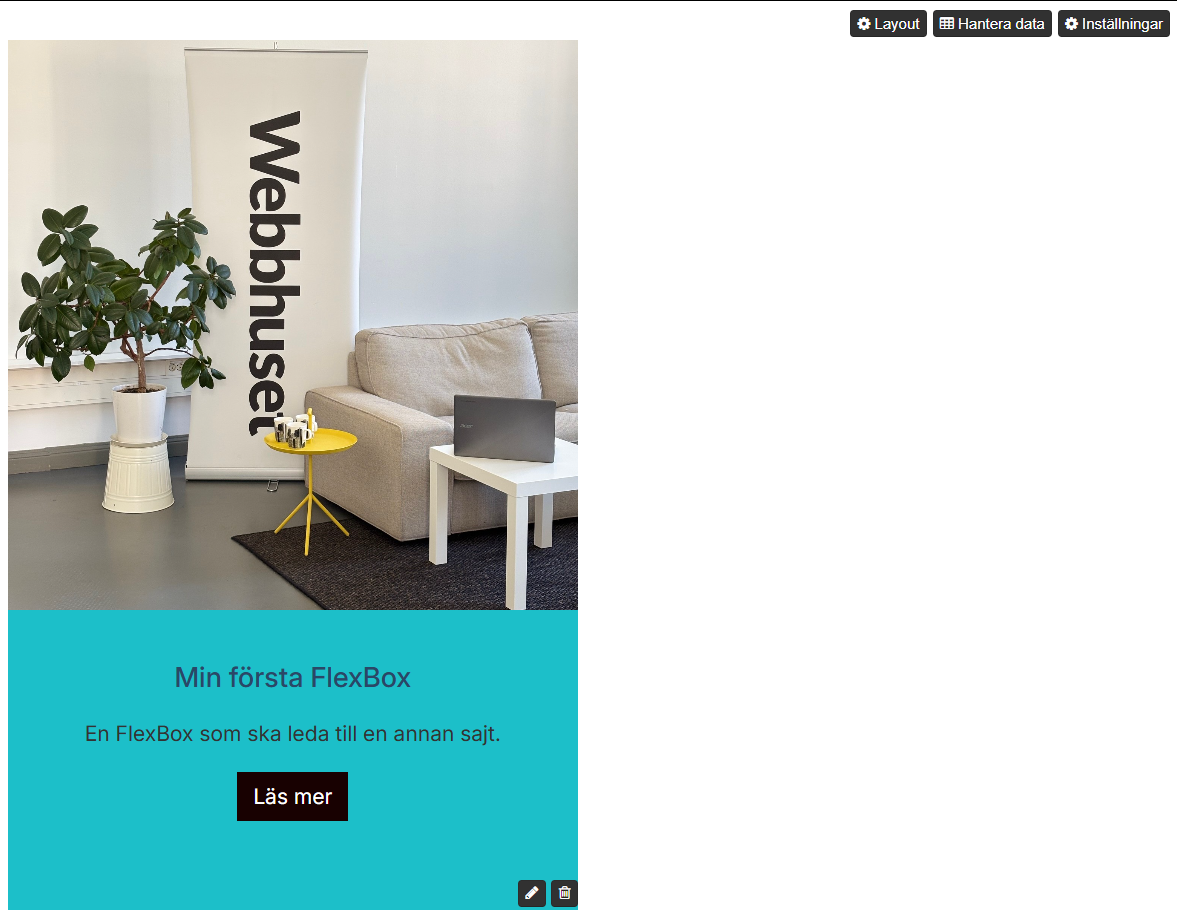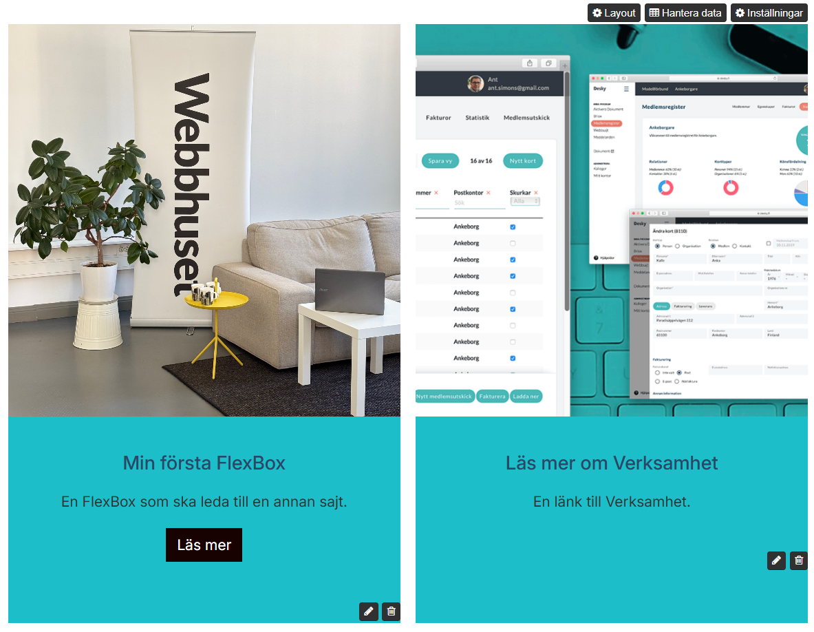 Det går nu att skapa en FlexBox bredvid den första. I inställningarna valdes i detta fall att det skulle vara två kolumner (två bilder bredvid varandra med text under bild). Den andra FlexBoxen läggs till på samma sätt som den första - Hantera data och Lägg till ny låda. I det här fallet läggs det till en ny låda som vill "lyfta" fram delen Verksamhet på sajten. Skillnaden nu blir att länken i FlexBoxen är till en annan del av vår sajt.
