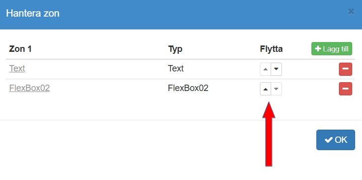 Nu finns FlexBoxen insatt på sidan. Om det redan finns moduler insatta på sidan så kommer FlexBox-modulen att automatiskt sättas in längst ned. Det går att flytta modulen upp och ned på sidan genom att klicka på pilarna.