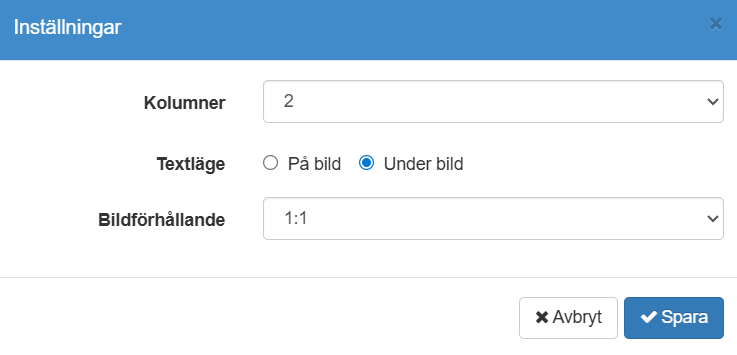 Kontrollera att det då är Kolumner: 2 och att textläge är: Under bild. Klicka därefter på Spara.