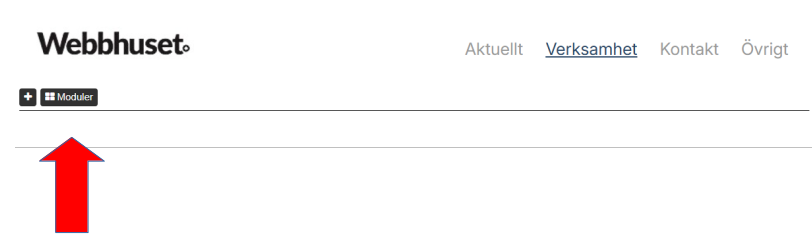 I det här exemplet ska vi lägga till en händelsekalender på en undersida som heter Verksamhet. Vi börjar med att gå till den undersidan och sedan lägga till modulen Händelsekalender. Klicka på moduler: