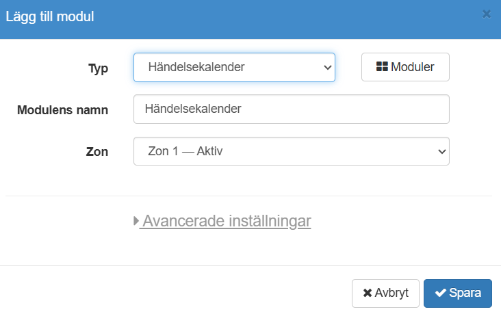 Välj därefter Händelsekalender från menyn med olika moduler och avsluta med att klicka på Spara.