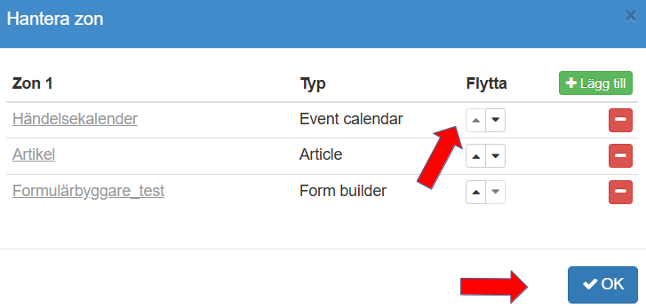 Då du klickat på Spara så kommer Händelsekalendern att automatiskt placeras längst ned på sidan. Det går att justera var på sajten modulen ska placeras genom att använda de små pilarna. I det här fallet vill vi ha händelsekalendern högst upp varför vi klickar på "pil upp" tills modulen är överst i listan och därefter klickar vi på OK: