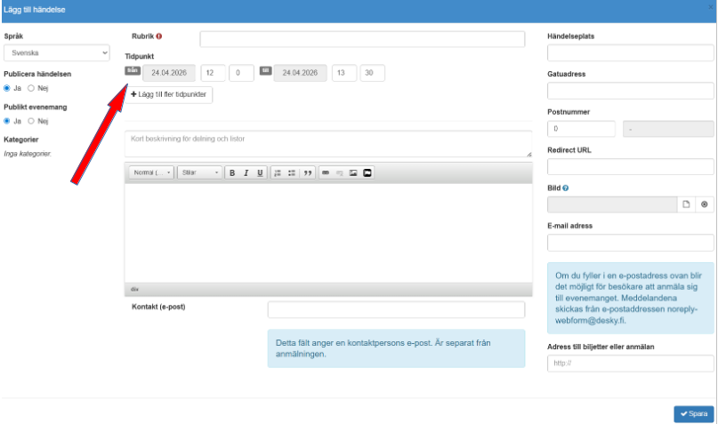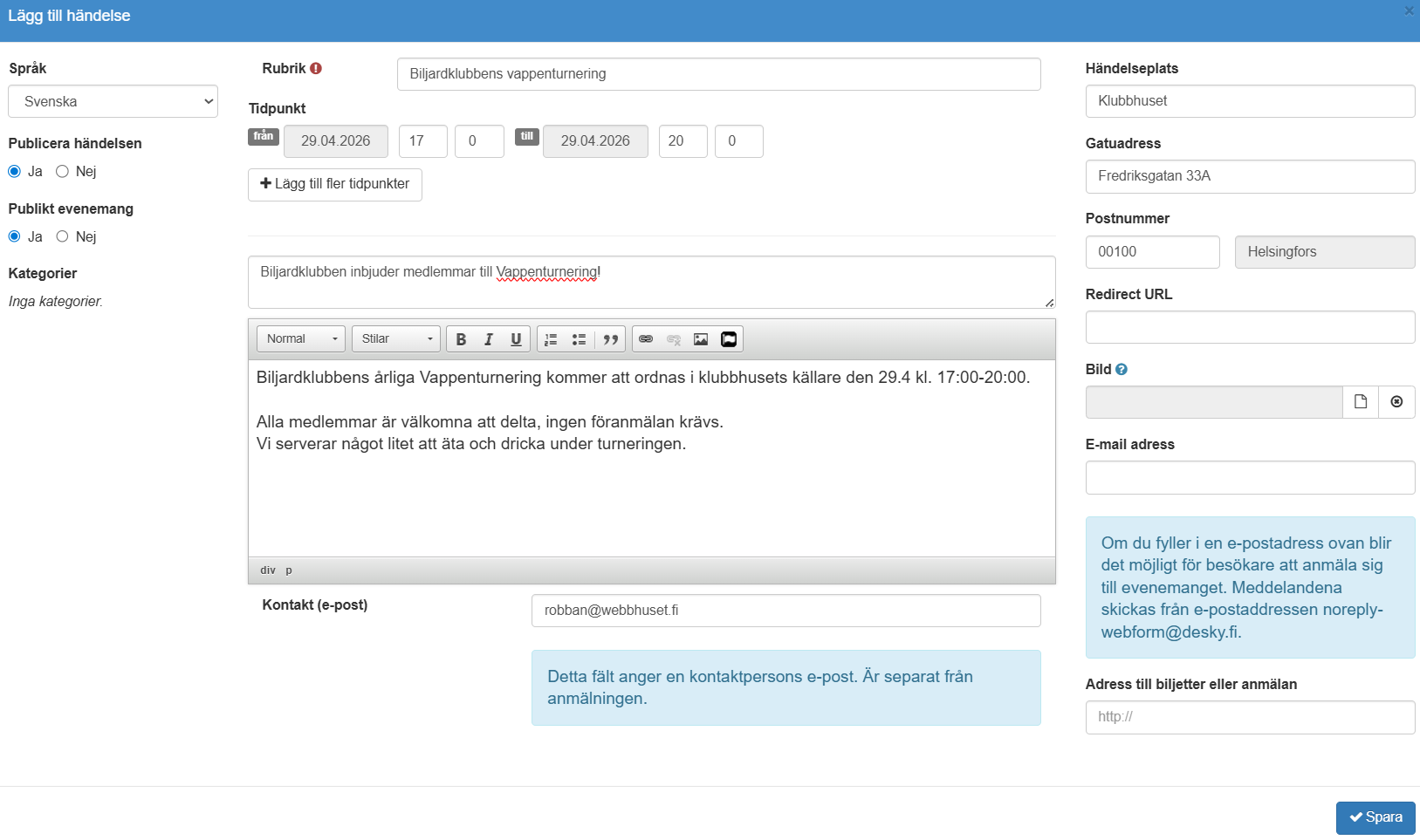 Bra att komma ihåg är att se till att språket är rätt. I det här fallet vill jag också publicera händelsen direkt och det är ett publikt evenemang. Rubriken är inskriven precis som datum och en kort text. Under texteditorn finns en e-postadress med. En adress till vilken, exempelvis, frågor kan riktas. Den högra delen av detta fönster handlar om plats för evenenmanget och där har adressuppgifterna fyllts i. Det finns också möjligheter att lägga till en bild: