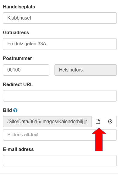 Bilden läggs till i den högra spalten (där adressuppgifterna för evenemanget finns). I det här fallet har vi valt att lägga till en bild som vi laddat upp i Digistoff. Därefter, klicka på Spara.