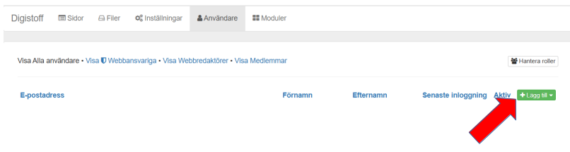 Tryck på Lägg till och välj om personen som läggs till blir användare (begränsade rättigheter) eller webbansvarig (fulla rättigheter).
