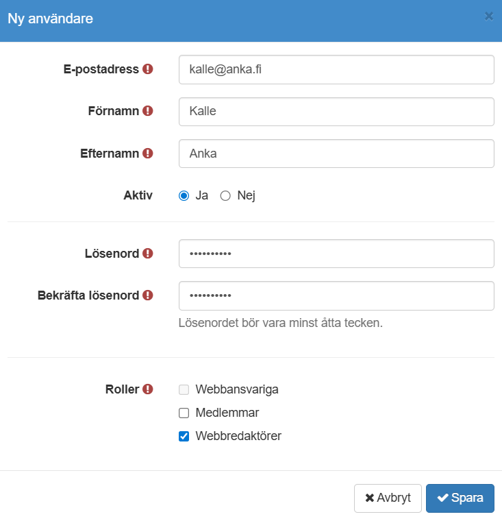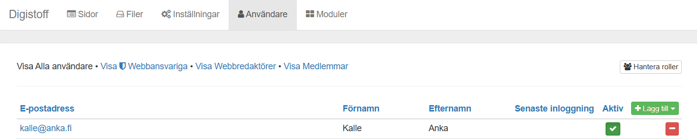 I det här fallet väljer vi att lägga till en person som användare. Fyll i fälten om användaren - e-postadress, förnamn, efternamn och lösenord. Då en webbansvarig lägger till en ny användare så skriver alltså den webbansvariga in ett lösenord till den nya användaren. I Digistoff ska ett lösenord vara minst 8 tecken. Välj ett enkelt lösenord som du kommer ihåg - den nya användaren kan sedan byta det lösenordet till ett mer personligt lösenord. I det här fallet, längst ned, välj också alternativet webbredaktör då vi önskar att denna användare ska ha möjlighet att till exempel lägga till texter/innehåll på sajten och klicka slutligen Spara.