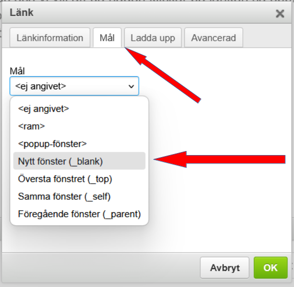 Markera den inklistrade länken och klicka därefter igen på verktyget för Infoga/Redigera länk. I det nya fönstret som öppnas klicka på Mål (övre röda pilen) och då öppnas en flervalsmeny. Klicka på Nytt fönster och därefter Ok.