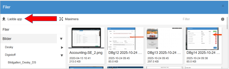 Webbhuset erbjuder Desky Dokument som en lösning för detta. Desky Dokument är en tjänst var det går att ladda upp, spara och dela dokument och filer ifrån. Ett sätt att, exempelvis, visa upp ett bildspel/bildgalleri på utan att det gör en hemsida långsam är att skapa ett bildspel/bildgalleri i Desky Dokument. Därefter länka bildspelet till hemsidan. Mer att läsa om detta finns i denna artikel på våra hjälpsidor.