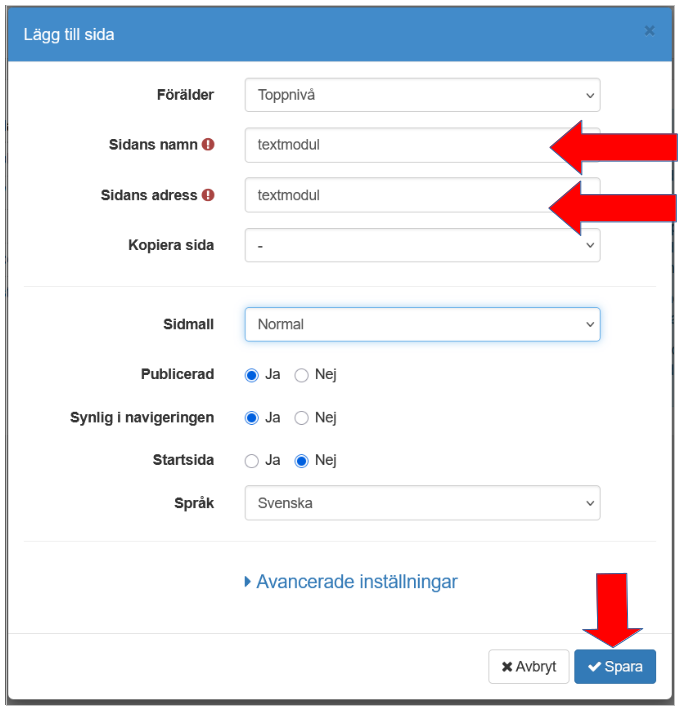 Välj modultyp Text från rullgardinsmenyn, mata in Modulens namn och klicka på knappen Spara.