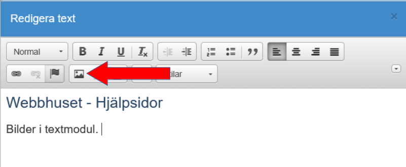 Klicka markören på den plats i textmodulen du vill att bilden skall sättas (i detta fall så är det en tom textmodul så markören är på första raden, längst till vänster). Fortsätt med att klicka på "bild-ikonen" på menyraden, så som den röda pilen visar.