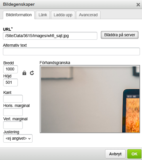 I den här rutan kan bildens bredd och höjd ändras. Klicka i rutorna och skriv in de nya värdena. Det går också att i rutan för Bredd skriva in ett procenttal, till exempel 80% - då krymps bilden automatiskt till 80% av den ursprungliga storleken.