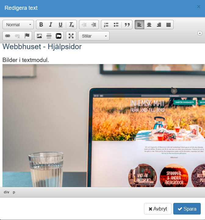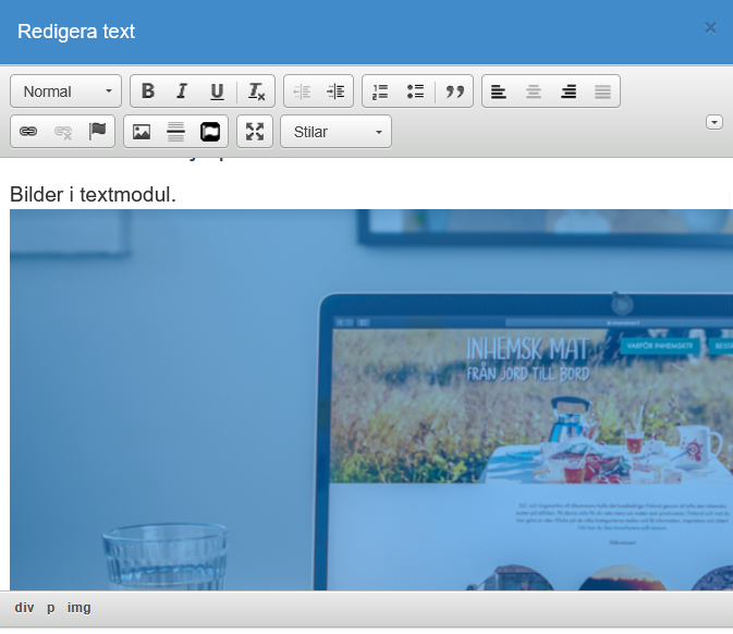 Efter att du tryckt på OK-knappen kommer du tillbaka till textmodulen och där syns bilden med nya egenskaper. Avsluta genom att klicka på blå Spara-knappen för att se slutresultatet.
