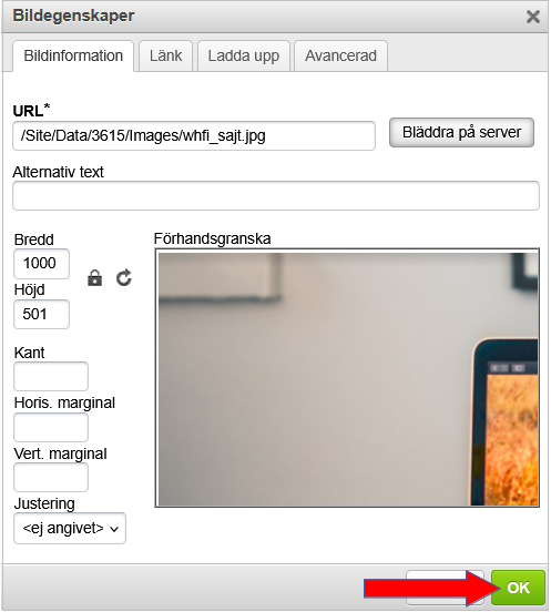 I rutan som öppnas så ser du information om bilden. Vi återkommer nedan till hur storleken på bilden kan ändras. Först så väljer vi dock att spara bilden genom att klicka på den gröna OK-knappen.