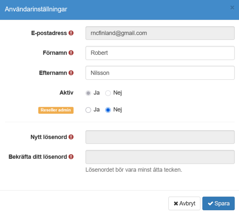 I det nya fönstret som öppnats går det att göra ändringar. Användarnamnet måste vara en riktig e-postadress, och lösenordet måste skrivas in två gånger.